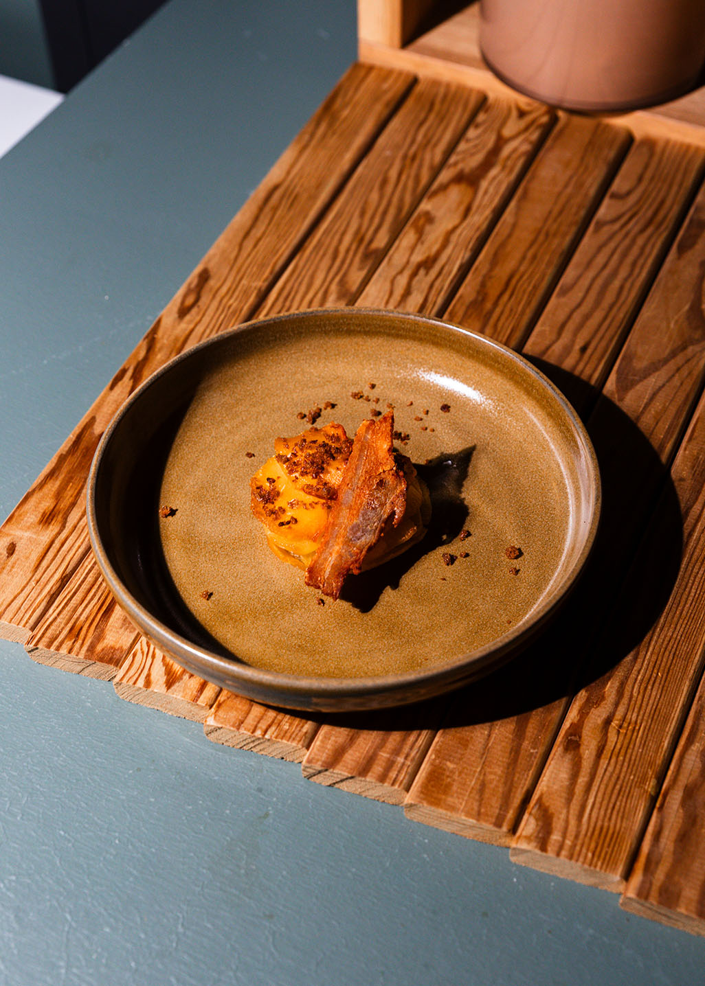 Nosta annoskulhosta lanttupino lautaselle, aseta rapea siankylkisiivu päälle ja paahdetut ruisleipäkuutiot.